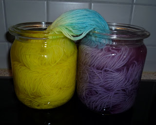 Hab die farblosen Wollstränge erstmal eingeweicht...